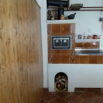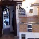 Kachlový sporák s kobkou a jednou troubou. Rozebrána původní nevyhovující kamna a přestavěna na kuchyňský sporák. Zajímavým prvkem sporáku je omítaná římsa.